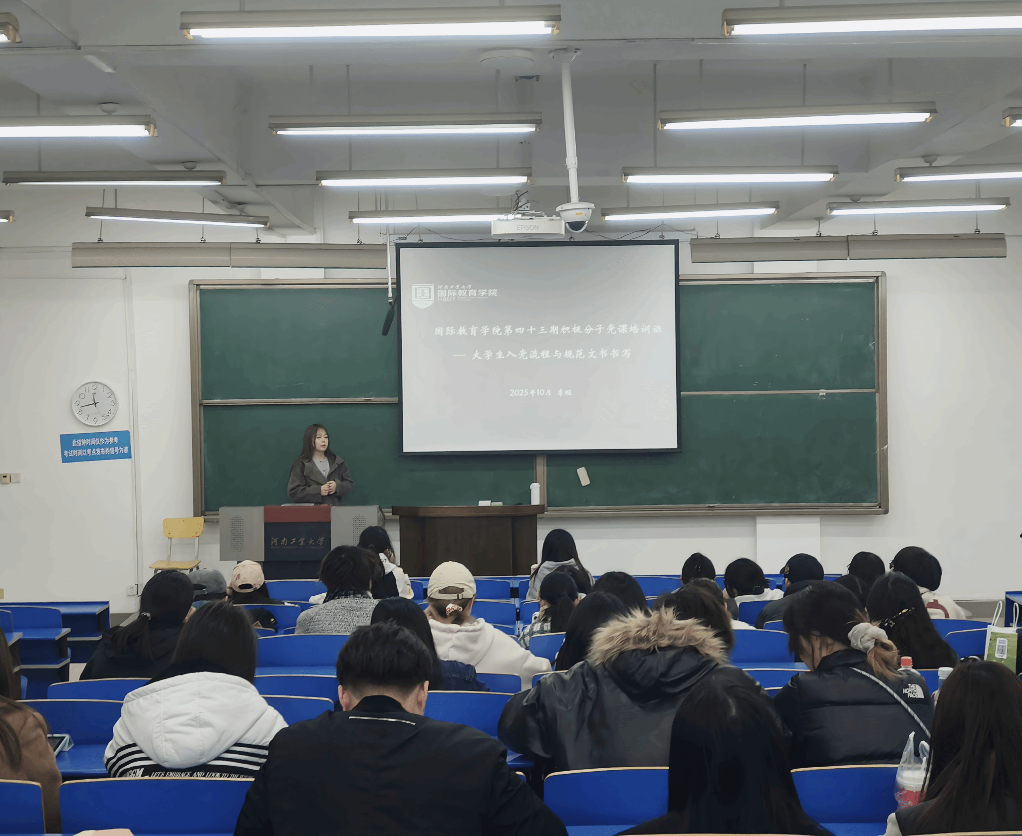 为提高入党积极分子的思想政治素质,端正入党动机,激发广大青年学生的入党热情,10月29日13:00,河南工业大学国际教育学院第四十三期积极分子党课培训4121教室如期进行,本期培训共102名入党积极分子参与,由学生第一党支部书记李程主讲“入党启蒙——大学生入党流程及规范入党文书书写”专题课程。
