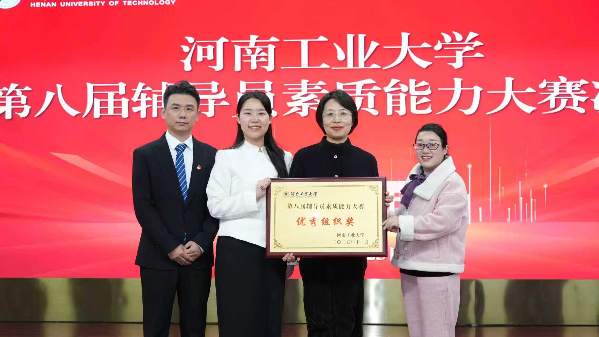 11月25日下午,我校在学术报告中心D303报告厅举办第八届辅导员素质能力大赛暨颁奖典礼。此次大赛中,我院成绩斐然,学工办主任鲁鹏斩获特等奖,辅导员刘心睿荣获一等奖,辅导员宋志华荣获三等奖,同时,学院凭借出色表现荣获“优秀组织奖”。