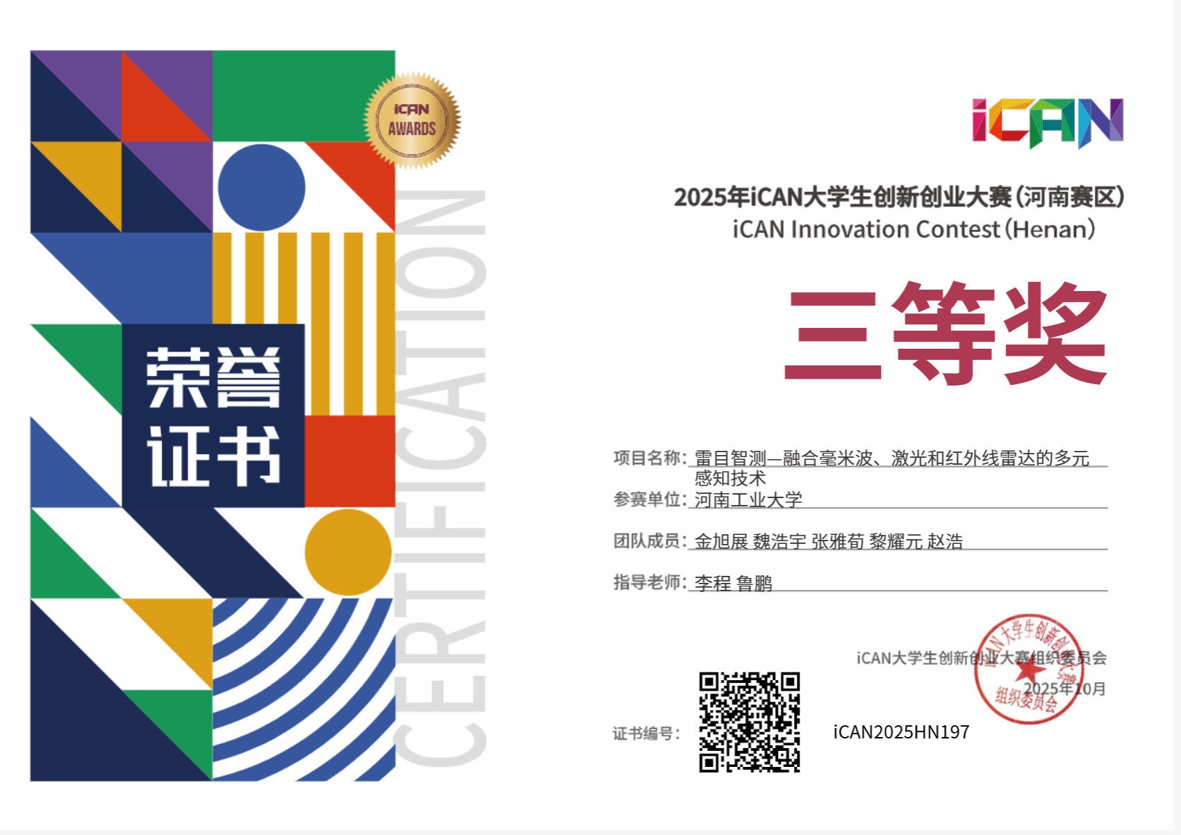 近日,由iCAN国际联盟、教育部创新创业教育指导委员会等单位主办,郑州商学院承办的2025年iCAN国际创新创业大赛河南省赛区决赛成功落下帷幕。本届省赛以“创新引领未来,创业成就梦想”为主题,吸引了全省的30支优秀队伍同台竞技,充分展现了当代大学生勇于创新、敢于实践的青春风采。由我校学生的“雷目智测-融合毫米波、激光和红外线雷达的多元感知技术”项目荣获河南赛区三等奖。