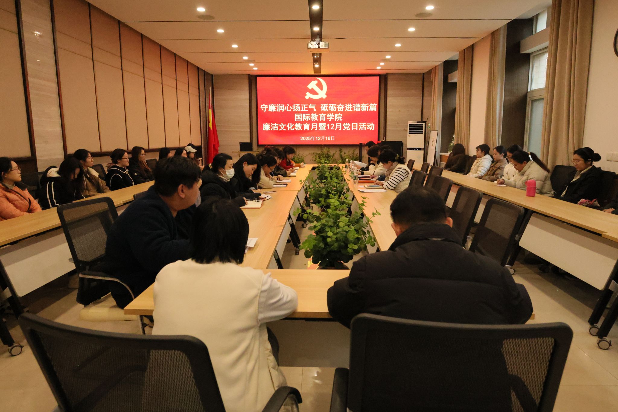 为深入贯彻习近平总书记关于廉洁文化建设和党的纪律建设的重要论述,落实中共中央办公厅《关于加强新时代廉洁文化建设的意见》与省委《关于推进清廉河南建设的实施意见》要求,进一步筑牢校园廉洁文化根基,12月16日,国际教育学院在6254会议室举办廉洁文化教育月暨主题党日活动。学院全体教工、学生支部党员代表参会,活动由党委副书记兼纪委书记孙腾主持。