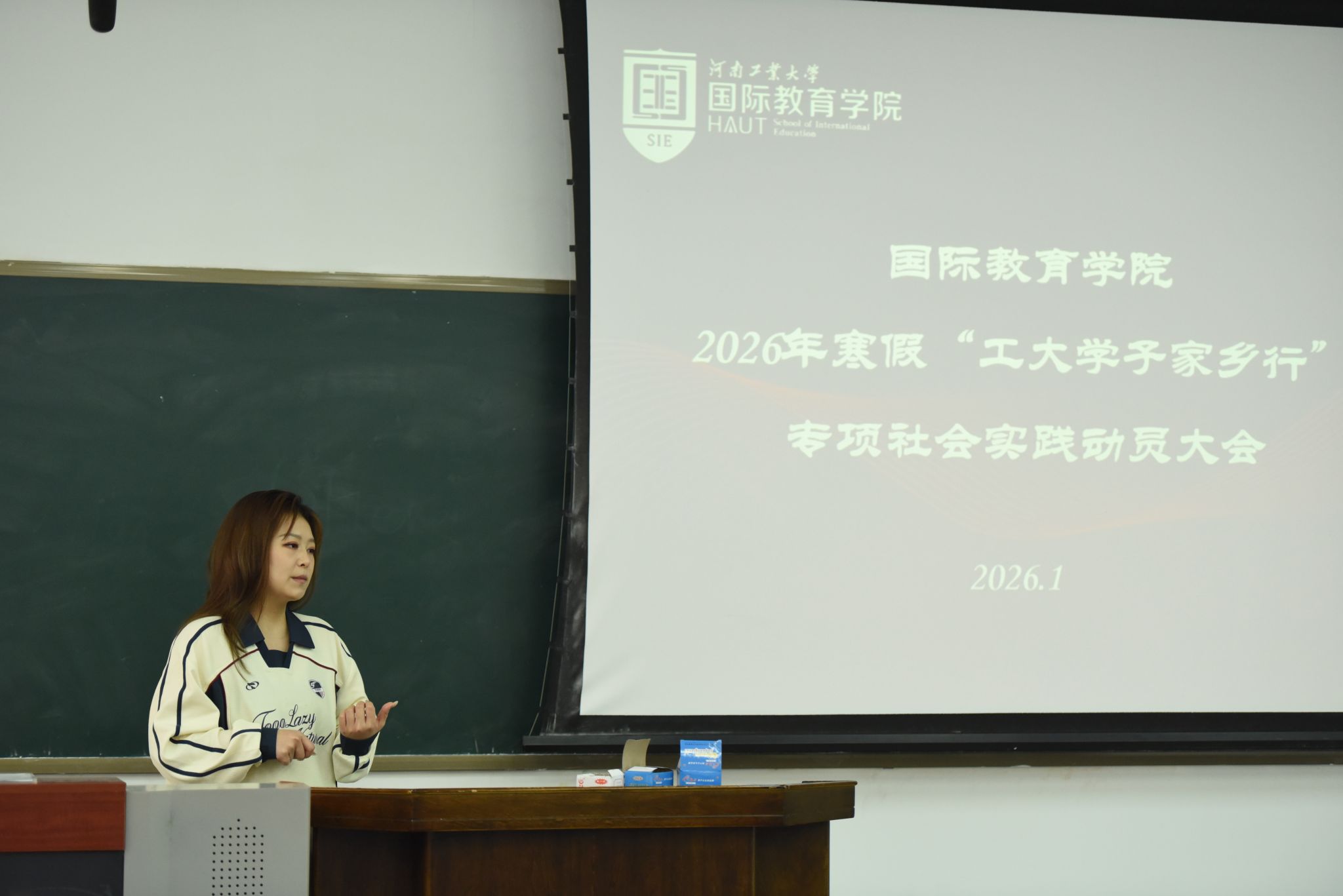 为进一步提高学校的社会影响力,吸引更多优质生源报考我校,同时锻炼和提升在校学生的社会实践能力。2026年1月4日,国际教育学院于4140教室举行“2026年寒假‘工大学子家乡行’专项社会实践培训大会。学院党委副书记孙腾、全体辅导员出席会议,社会实践优秀学生代表以及本次报名社会实践的全体学生共同参与,会议由院团委书记李程主持。