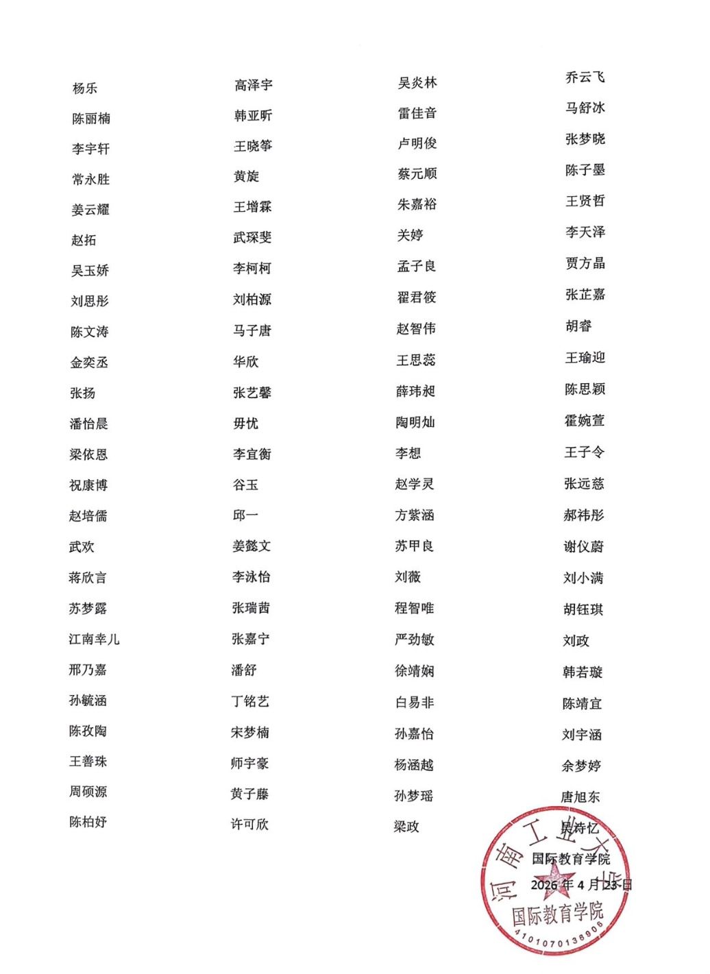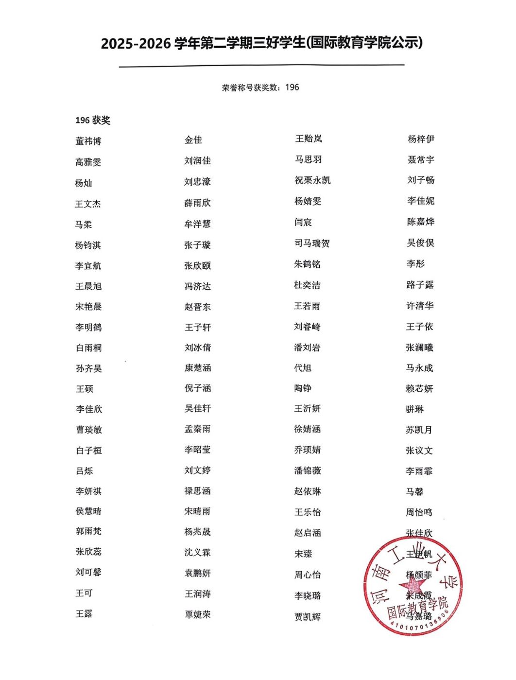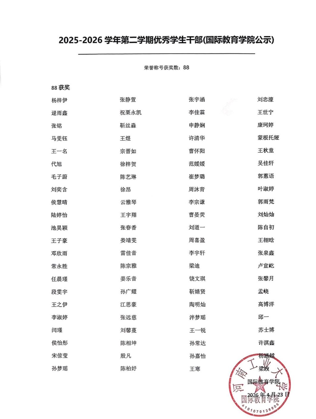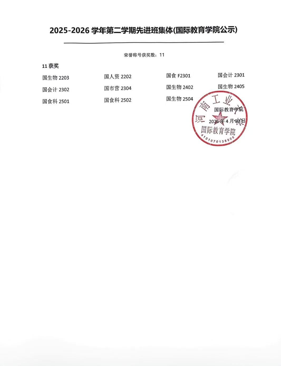 关于2026年河南工业大学国际教育学院“三好学生”、“优秀学生干部”、“先进班集体”评选结果公示