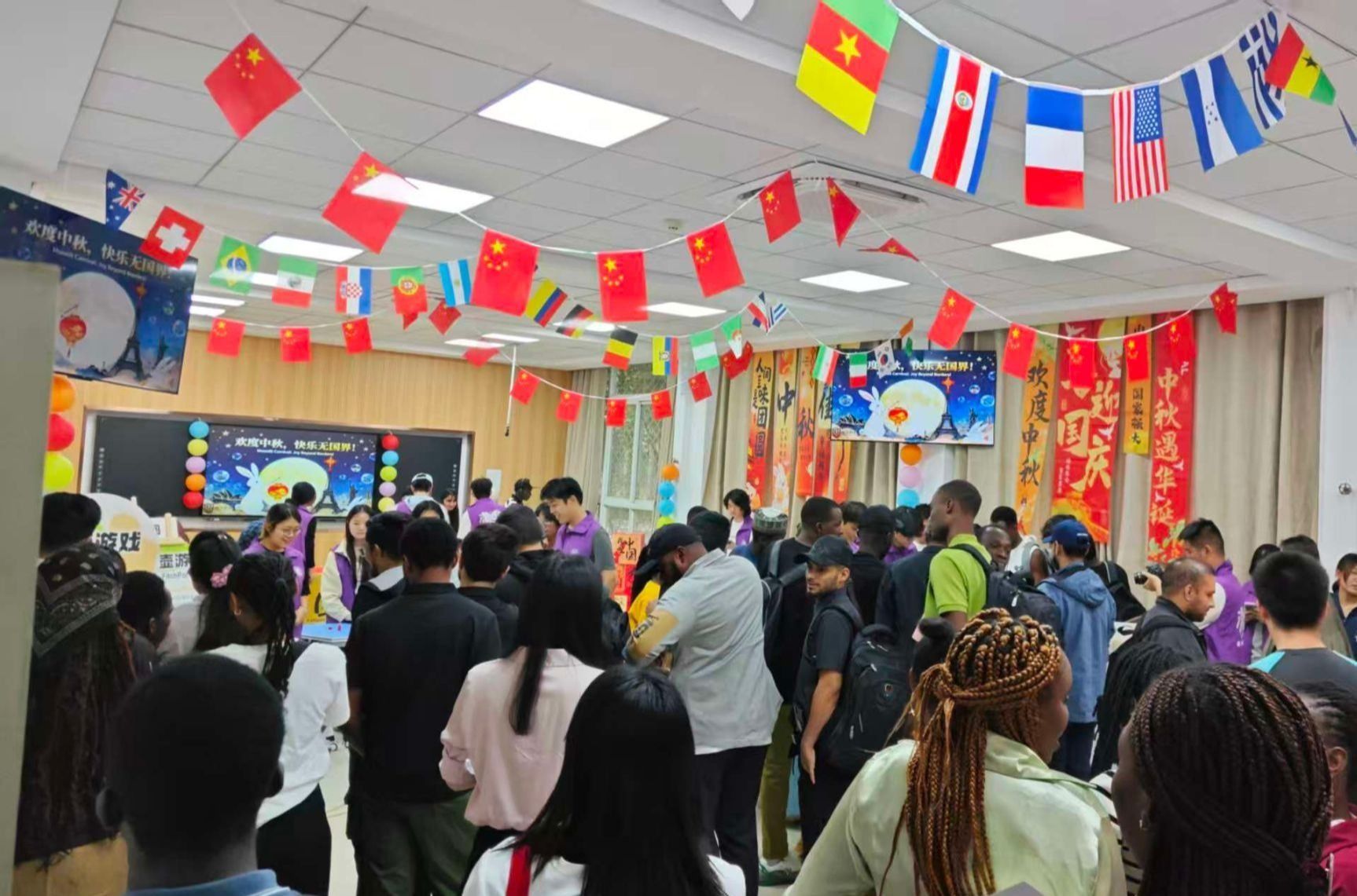 桂香袅袅,月满情浓。9月30日下午,国际教育学院于惟学楼6126、6140活动室举办“欢度中秋,快乐无国界”中外学子中秋游园会。本次活动融合文化讲座、美食品鉴、艺术观赏与互动游园多种形式,为中外学生打造了一场沉浸式的中国文化体验,活动现场气氛热烈。国际教育学院党委书记万淼、院长张浩军、副院长鲍宇茹、党委副书记孙腾,以及外语学院教师代表蒋志敏、郭平、魏洁出席活动,来华留学科室及学工办教师代表共同参与,50余名中外学子参加活动。