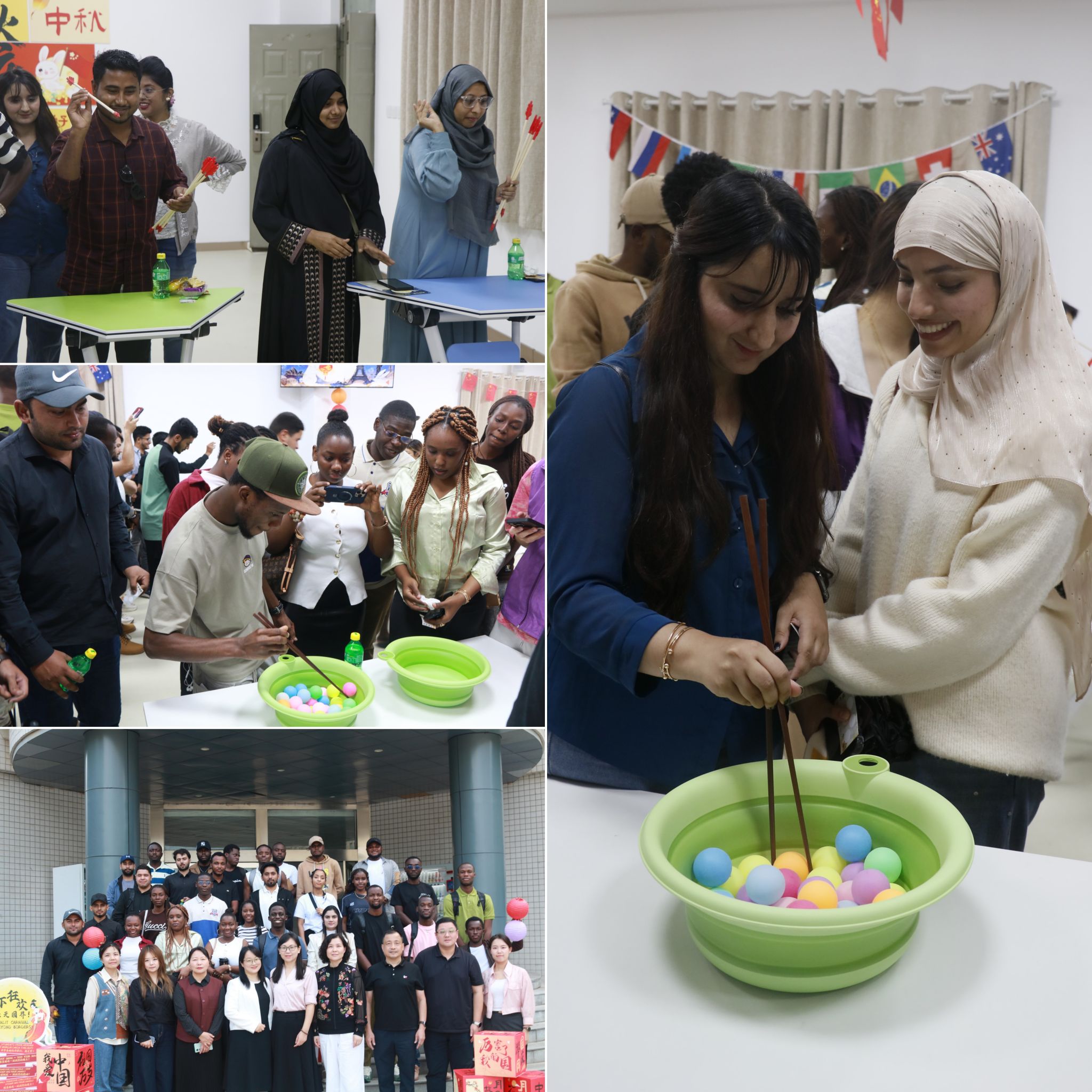 “游园会”游戏体验环节,投壶、夹乒乓球、共创百福图共三项传统游戏的摊位前人头攒动。留学生们在志愿者的引导下兴致勃勃地逐一体验。从投壶时的屏息凝神,到夹乒乓球时的欢声笑语,再到执笔挥毫写下“福”字的美好祝愿,每一位中外学子都在实践中深度感知了中国传统文化的趣味与智慧。