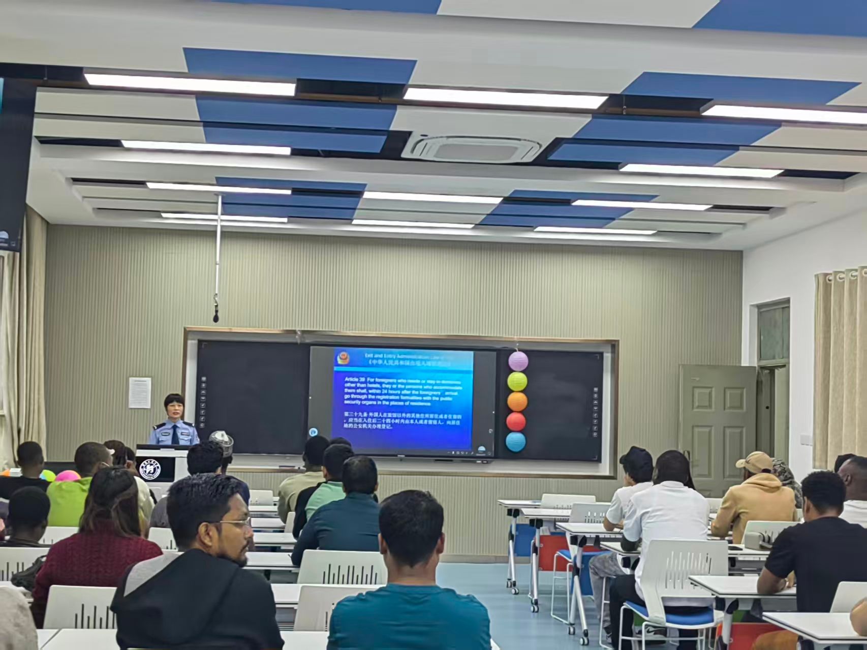 随后,李立警官为留学生们讲解了《中华人民共和国出境入境管理法》和《中华人民共和国治安管理处罚法》等相关法律法规,针对外事手续办理、在华就业、住宿登记等相关法律法规进行了详细解读,并提醒留学生们遵守我国法律法规,诚信守法,确保留学期间平安顺利。