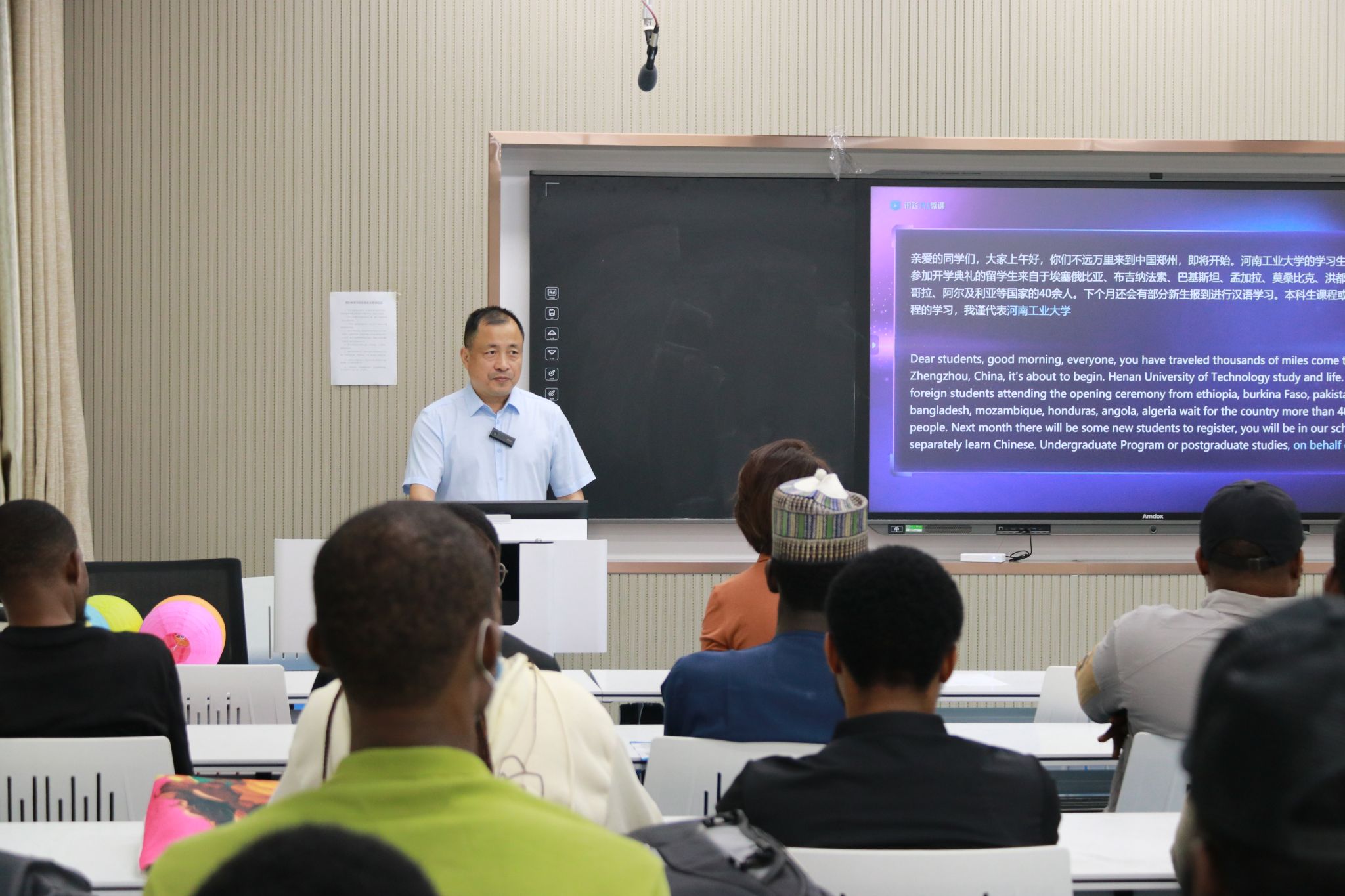 典礼上,优秀新生代表博士研究生盖兹同学发言,分享了硕士阶段在我校就读的点滴;优秀教师代表粮油食品学院李倩老师寄语新生,鼓励他们勤奋学习、追求卓越,以优异成绩完成在华学业。最后,来华留学生管理科的老师们分别就学校规章管理制度、宗教管理制度、学籍管理、奖学金评审、交通安全、法治安全、校园学习与生活指南等方面进行了详细讲解,希望国际学生们能遵守法律法规、校纪校规,尽快适应新的学习生活环境,在中国度过安全快乐的大学生活。