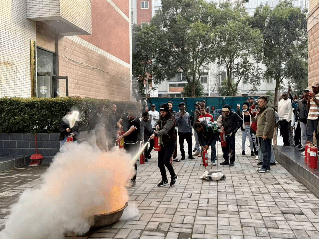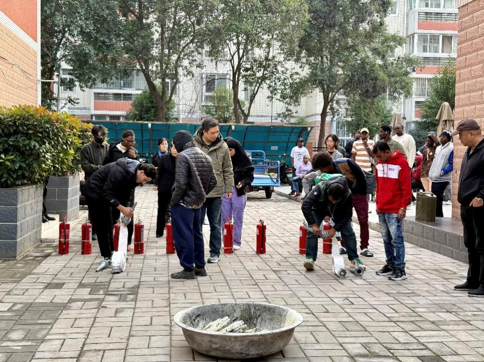 在公寓院内进行的灭火实操环节中,保卫处消防科教师现场演示了干粉灭火器的正确操作,并分类讲解不同火情的应对策略。留学生们踊跃参与,轮番上前进行灭火练习,在实践中掌握了初期火灾的扑救技能。